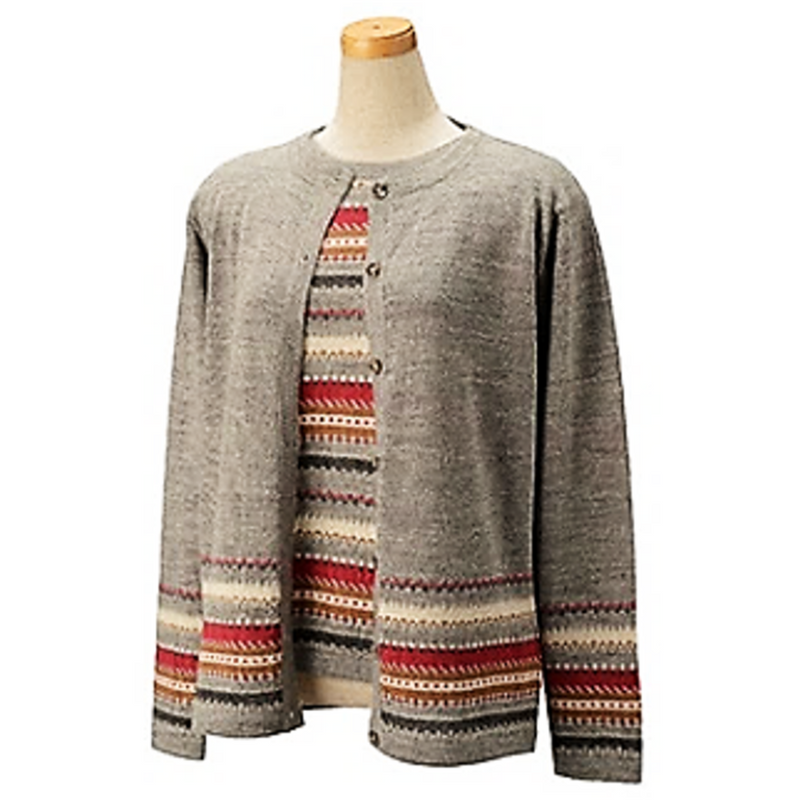 Made entirely from Alpaca wool, this cardigan is lightweight yet remarkably warm. Its superior thermal properties come from alpaca wool’s natural ability to trap warm air while allowing moisture to escape, keeping you cozy without overheating. Featuring a chic greige color with a tasteful border pattern, this design exudes timeless sophistication.