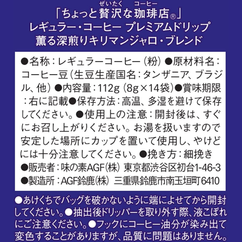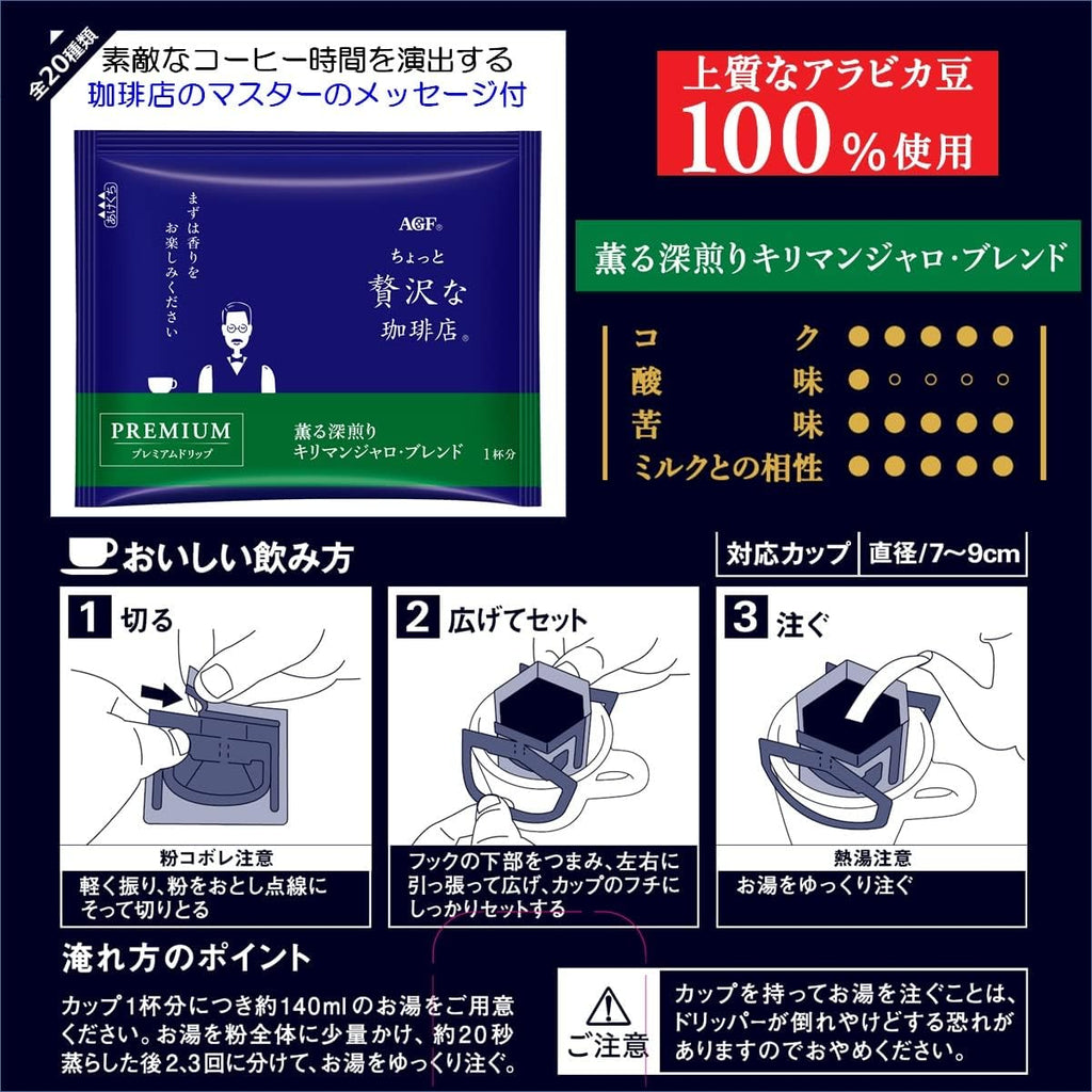 Experience the ultimate coffee indulgence with AGF Luxury Coffee Drip Coffee Deep Roast Kilimanjaro Blend. This exquisite blend, crafted with the finest beans from the slopes of Mount Kilimanjaro, promises a coffee experience like no other. Savor the bold, deep roast that transports your senses straight to the heart of Tanzania. Each sip offers a unique harmony of rich, full-bodied flavor and smooth, satisfying aroma.