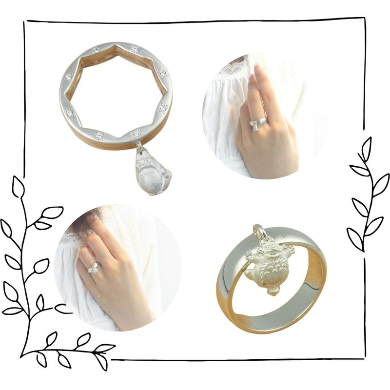 This playful design captures Totoro riding a traditional Japanese spinning top ("koma"), as seen in a whimsical flying scene. Totoro swings gently with your finger's movement, creating a dynamic and eye-catching accessory. A delightful piece for Totoro fans and jewelry lovers alike.