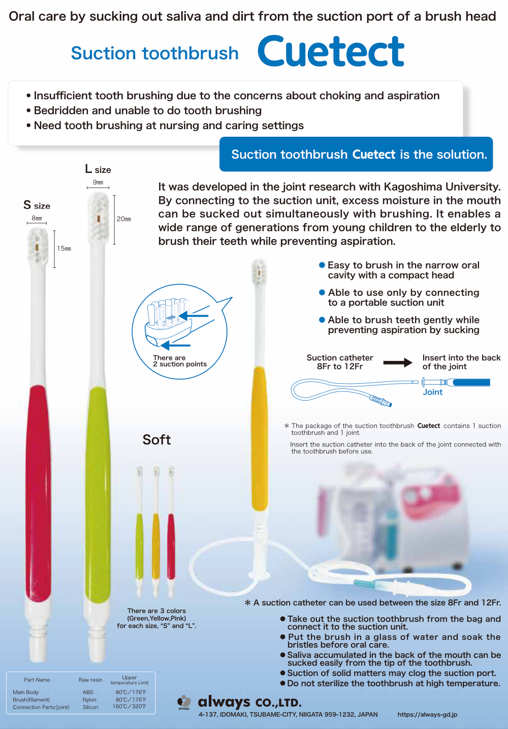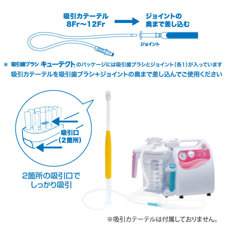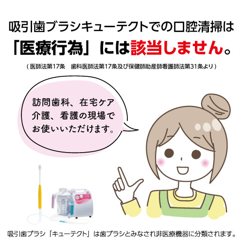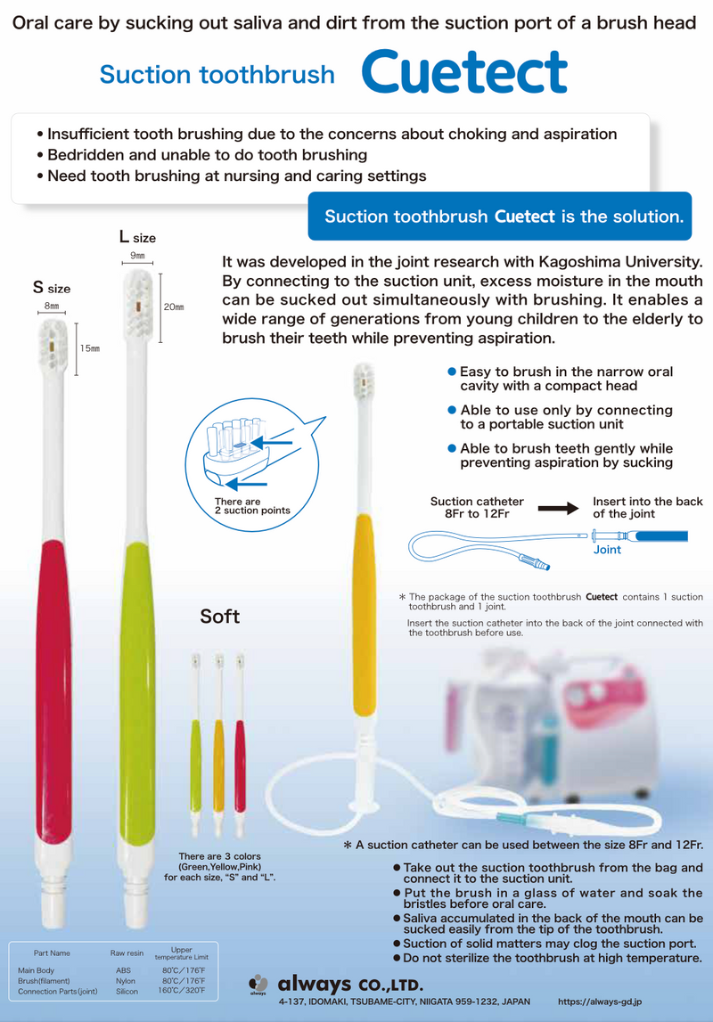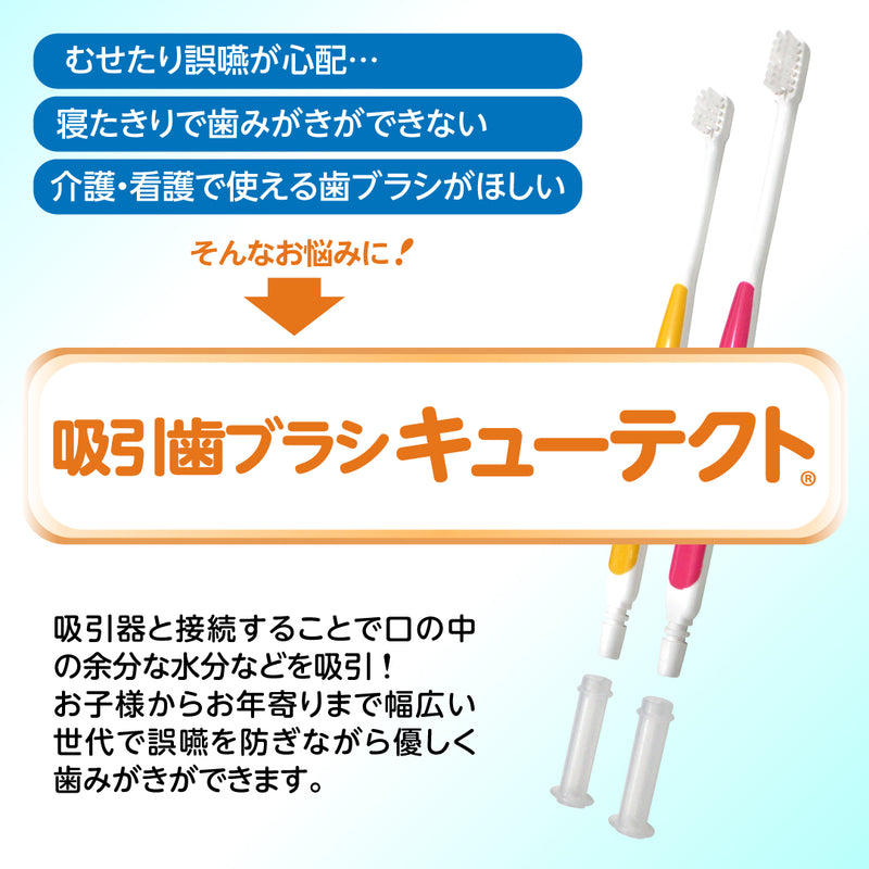 The Suction Toothbrush "Cutecht" is designed to perform oral care while suctioning saliva and debris, aiming to prevent aspiration. Developed in collaboration with Kagoshima University (Department of Pediatric Dentistry), this innovative toothbrush allows gentle brushing while simultaneously removing excess moisture from the mouth, suitable for a wide range of ages from children to the elderly.