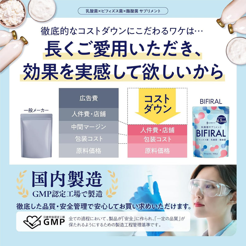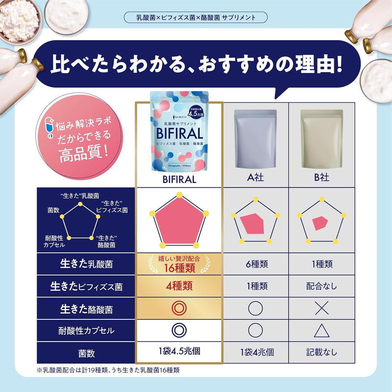 • High Concentration of Lactic Acid Bacteria: Each pack contains 4.5 trillion lactic acid bacteria (equivalent to approximately 450 servings of yogurt). BIFIRAL combines a rich blend of lactic acid bacteria, bifidobacteria, butyric acid bacteria, and nattokinase to support a healthy internal flora with just one tablet a day.