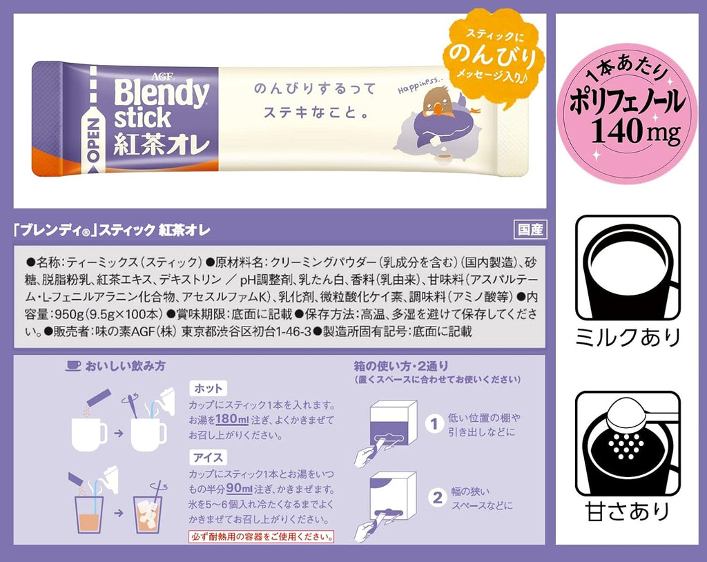 Crafted for loyal milk tea lovers, the AGF Blendy Stick Tea Lait offers a delicious and convenient way to enjoy your favorite beverage. With 24 individual sticks, each containing a perfect blend of tea and milk, you can experience the smooth and creamy taste anytime, anywhere.