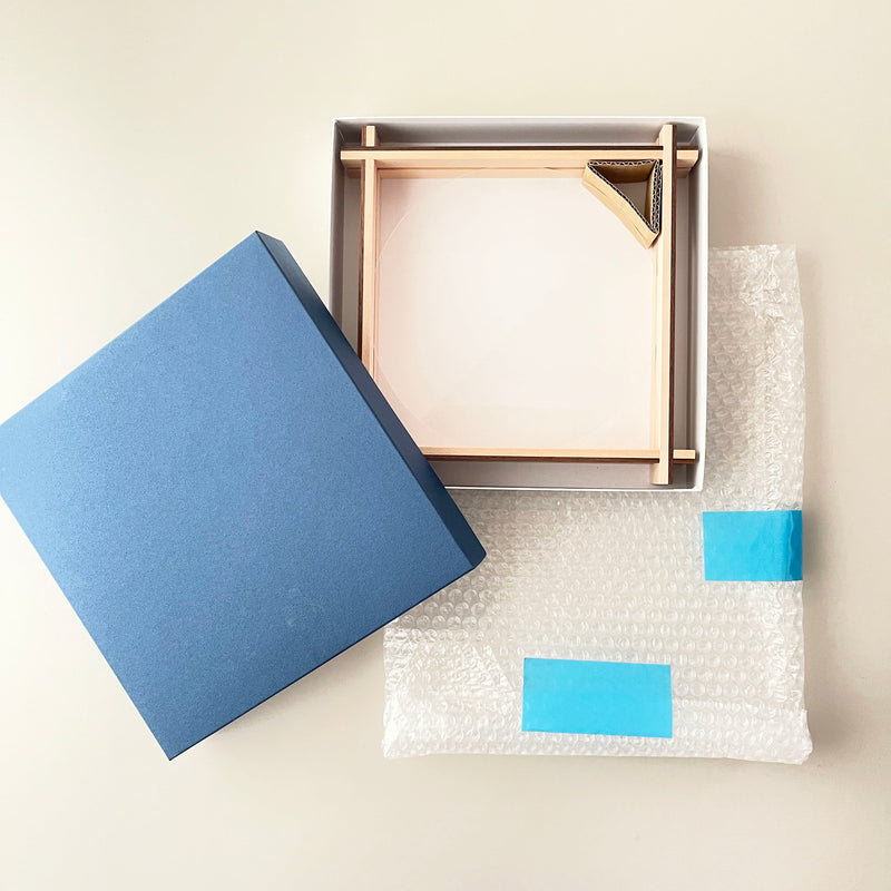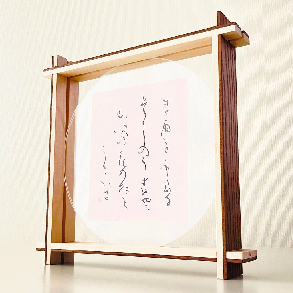 The wooden frame is meticulously crafted by Japanese artisans and can be displayed in two ways: standing or hanging. Both methods are easy to set up. The frame comes with two circular acrylic sheets. To display the piece standing, place the artwork in the center of one acrylic sheet, secure it with low-adhesive tape, and cover it with the second acrylic sheet. Insert the acrylic sheets into the gap in the wooden frame.
