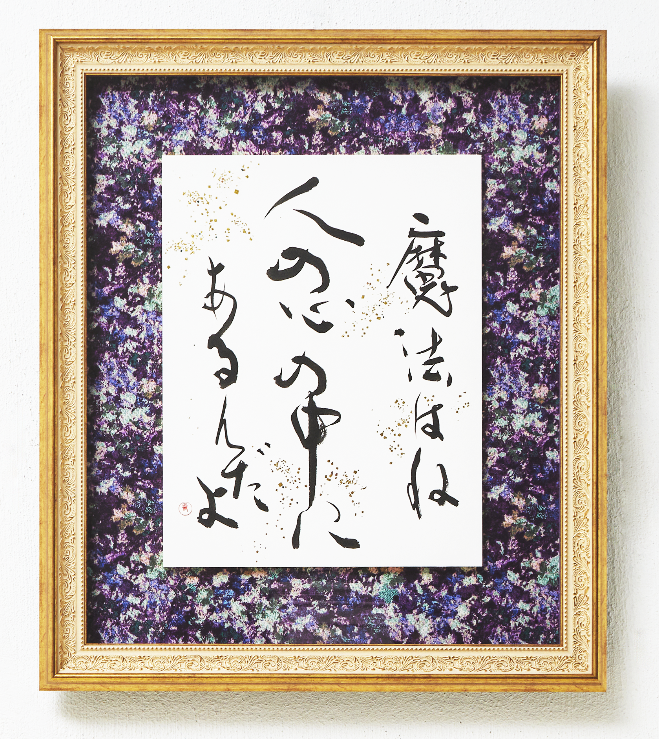 The calligraphy features the phrase, "Magic is in the heart of people," spoken by world-renowned Japanese fashion designer and event producer Kansai Yamamoto (1944–2020) in his final years. Written in Japanese, this piece bridges traditional calligraphy and modern artistic expression, making it a versatile addition to any space—whether urban and luxurious, sophisticated and classical, simple and everyday, or even a child's room.