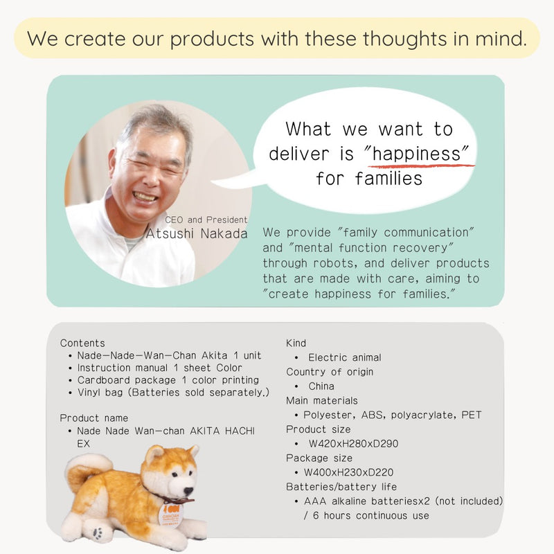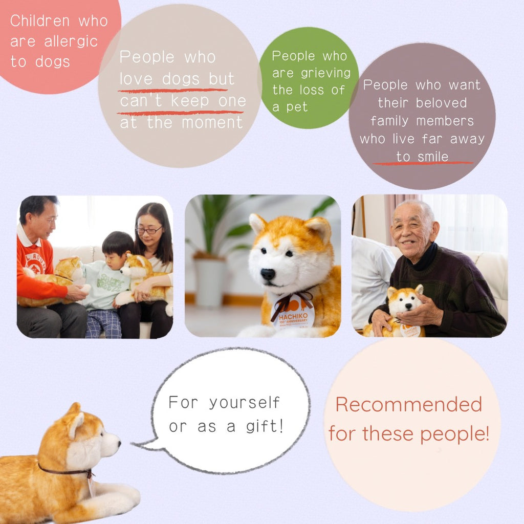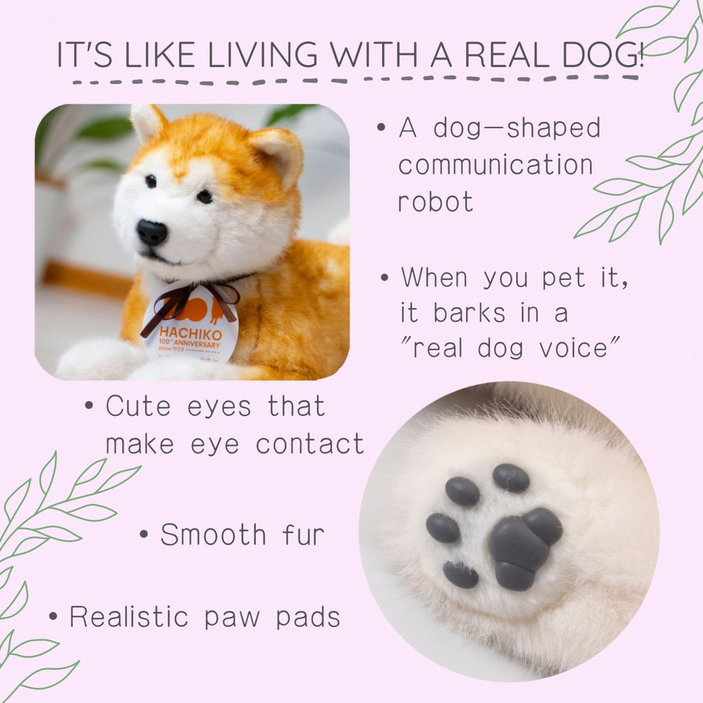 Petting Dog HACHI is a communication robot that replicates the experience of having a dog. Equipped with three static sensors located in various places within its plush body and in smartphone panels, it responds when called. Featuring recorded sounds of real dogs, it provides a realistic sense of pet ownership. With KIS certification, it has been acknowledged for its ability to improve communication with individuals with cognitive disorders.