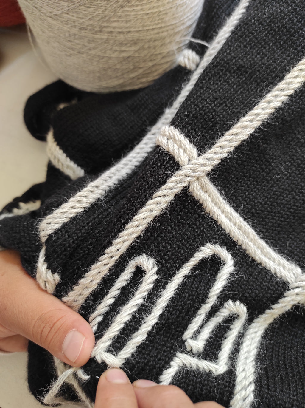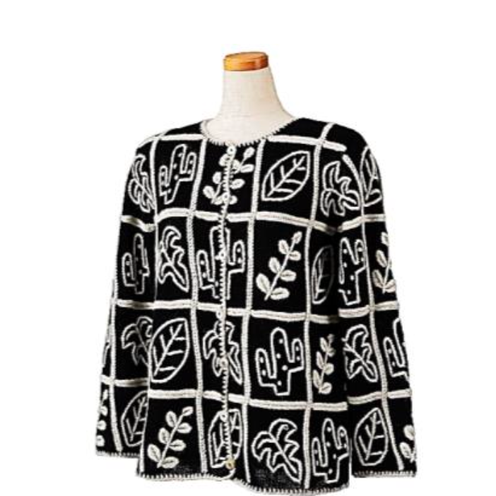 A standout feature of this cardigan is the intricate embroidery, meticulously handcrafted by skilled Peruvian artisans. The embroidery, in light gray thread against a black knit base, showcases artisanal excellence and attention to detail. The buttons, made from natural shell, add a touch of sophistication, reflecting the thoughtful craftsmanship in every aspect of this garment.