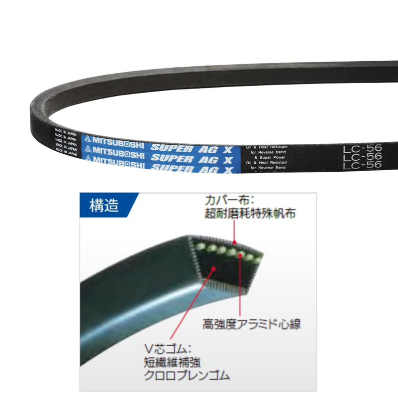 The MITSUBOSHI Super AG-X V-Belt is a top-of-the-line belt designed specifically for agricultural machinery. Manufactured by Mitsuboshi Belt Co., Ltd., this belt is engineered to withstand the most demanding work environments. It delivers exceptional durability and reliability, making it ideal for use in large agricultural machinery operating under high-load conditions. With its ability to perform consistently even in extreme conditions, this belt ensures long-lasting, smooth performance and minimizes the need for frequent maintenance.