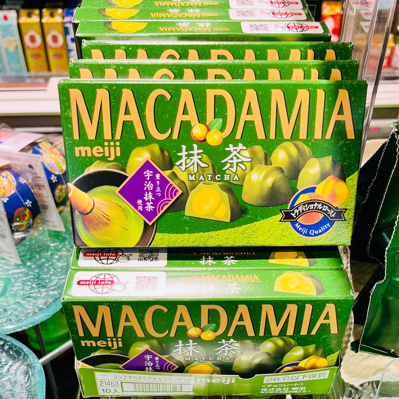 Ingredients: Sugar (imported), Cocoa Butter, Macadamia Nuts, Lactose, Whole Milk Powder, Vegetable Oil, Matcha, Skim Milk Powder, Emulsifier, Coloring Agents (Gardenia, Flavonoid), Antioxidants (Vitamin C, Vitamin E, Rosemary Extract), Flavoring (contains milk and soy).