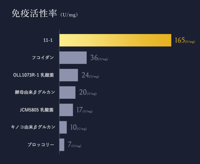 The University of Tokyo spent five years measuring the rate of natural immune activity using the "method of measuring natural immunity as a whole" against approximately 100,000 substances, and conducted an efficacy test against the multidrug-resistant bacteria "Pseudomonas aeruginosa" based on the outstanding value of 165 for 11-1 (second place was occupied by fucoidan with 36). The results showed clear efficacy only in terms of innate immune activity.