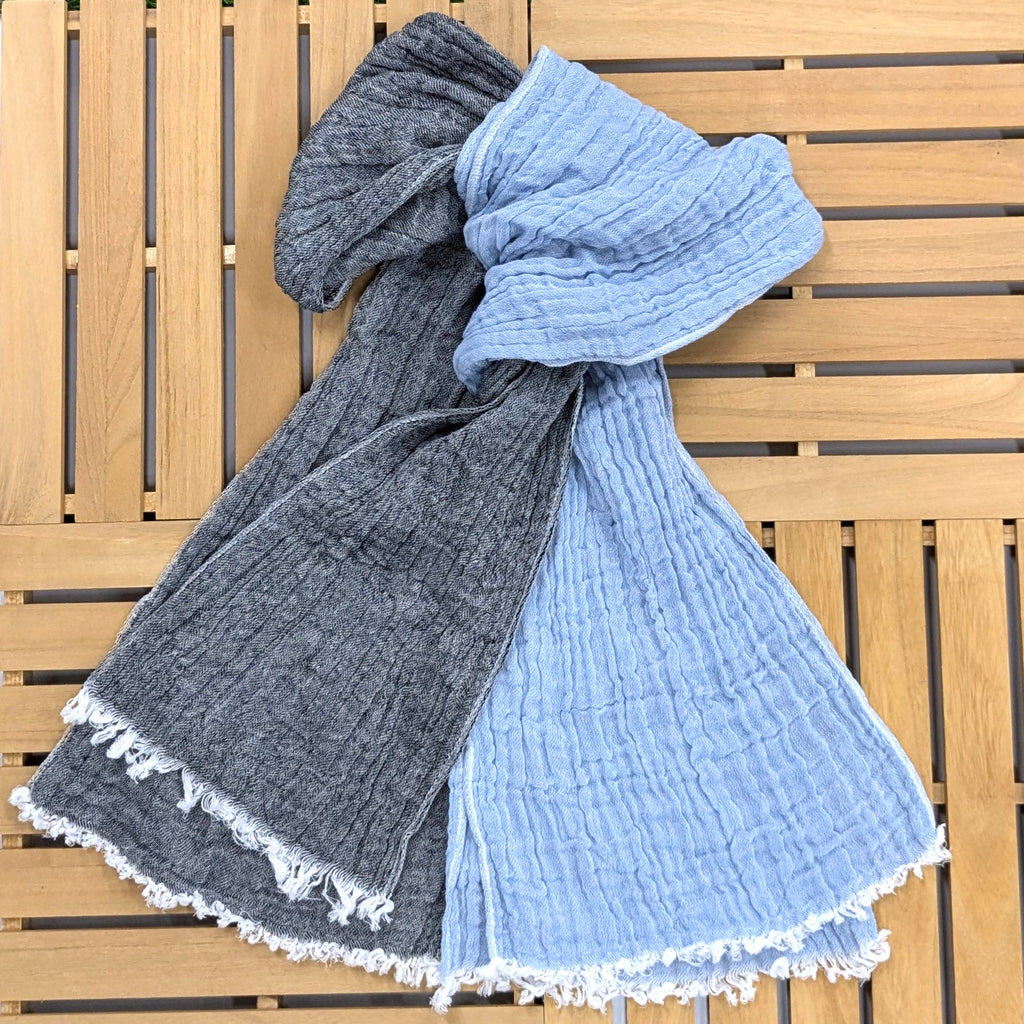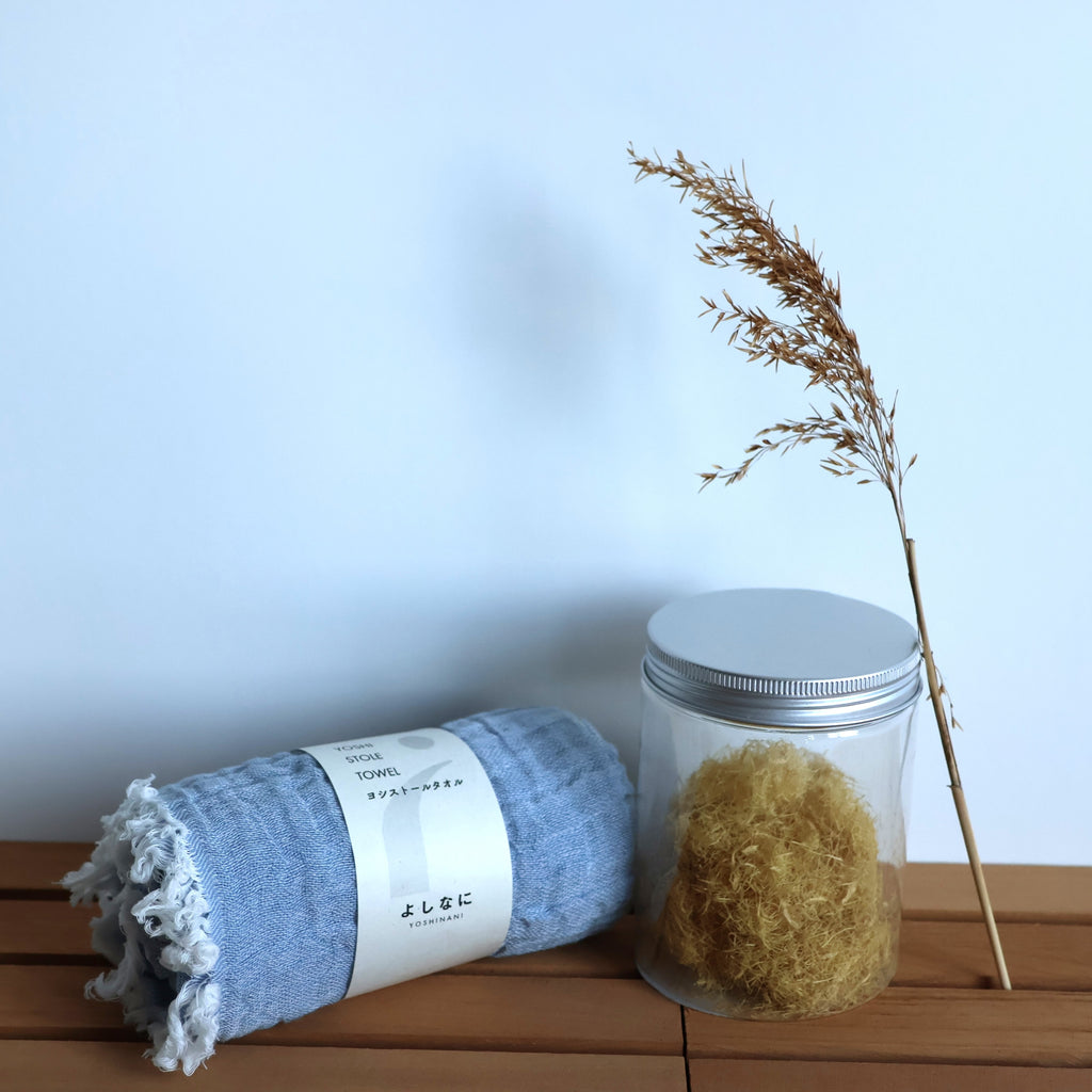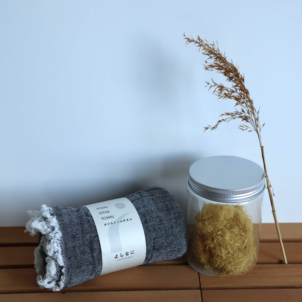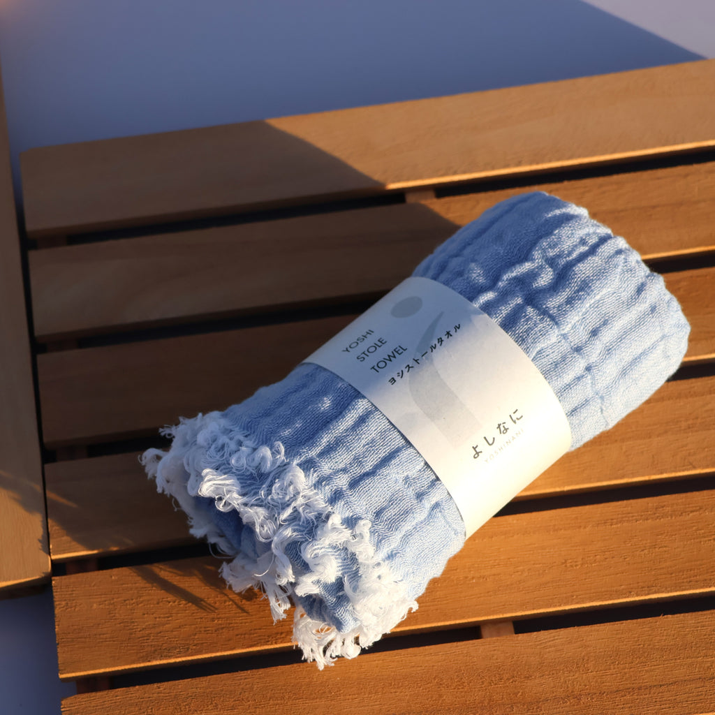 This stole-style towel is made using a special blended yarn that combines cotton and Japanese reed fiber (Yoshi).
