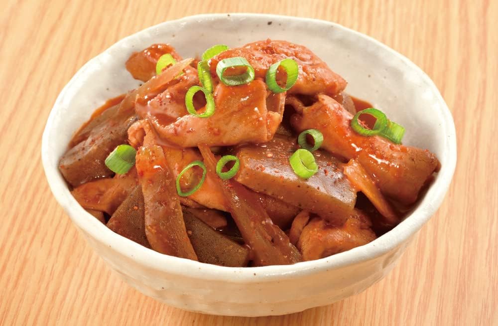 Konjac (made in Korea), pork offal (Japan), miso, sugar, burdock root, soy sauce, glucose-fructose syrup, honey, gochujang (Korean chili paste), doubanjiang (Chinese chili bean paste), salt, spices, rice fermented seasoning, sesame, ginger, garlic, vinegar-based seasoning, bonito extract, kelp extract, oyster sauce, dried sardine powder, seasoning (amino acids, etc.), alcohol, thickener (polysaccharides), calcium hydroxide (for konjac coagulation), paprika color.