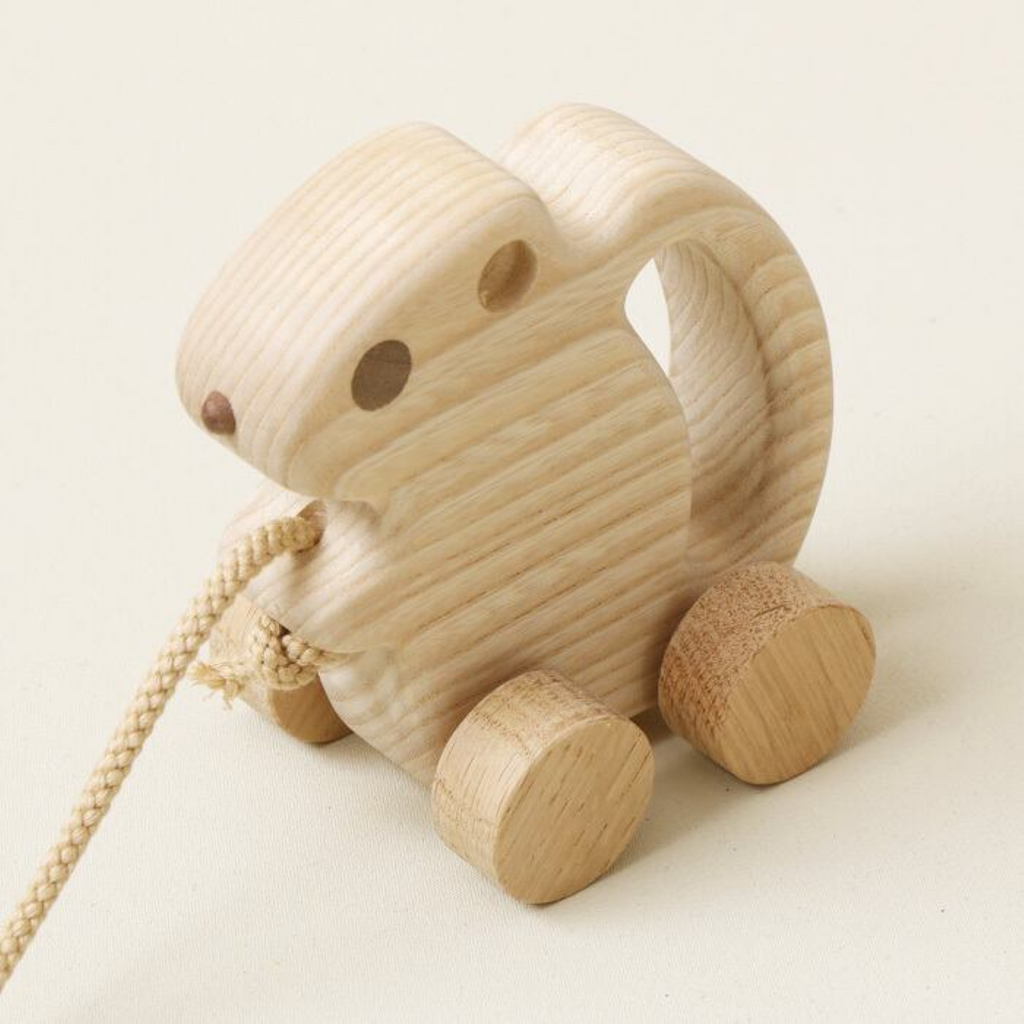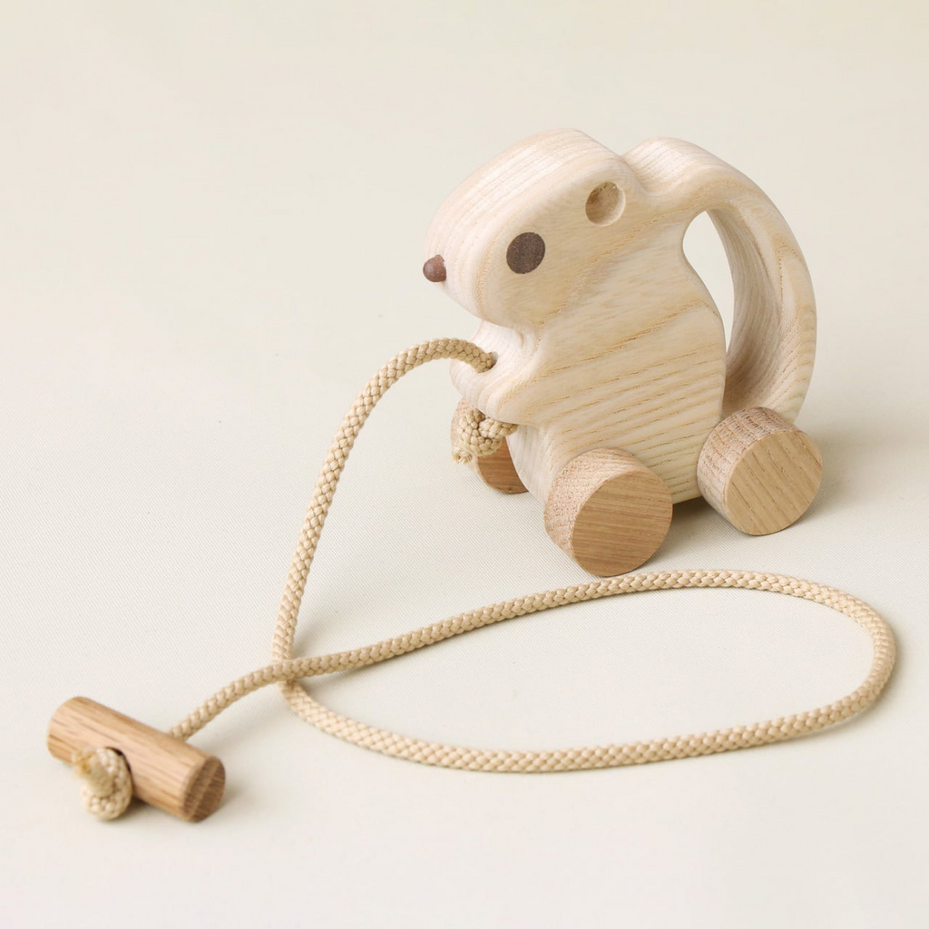 “Momongcar” is a charming wooden pull toy inspired by the Ezo flying squirrel of Hokkaido, Japan. The name is a playful combination of “Momonga” (Japanese flying squirrel) and “car.”