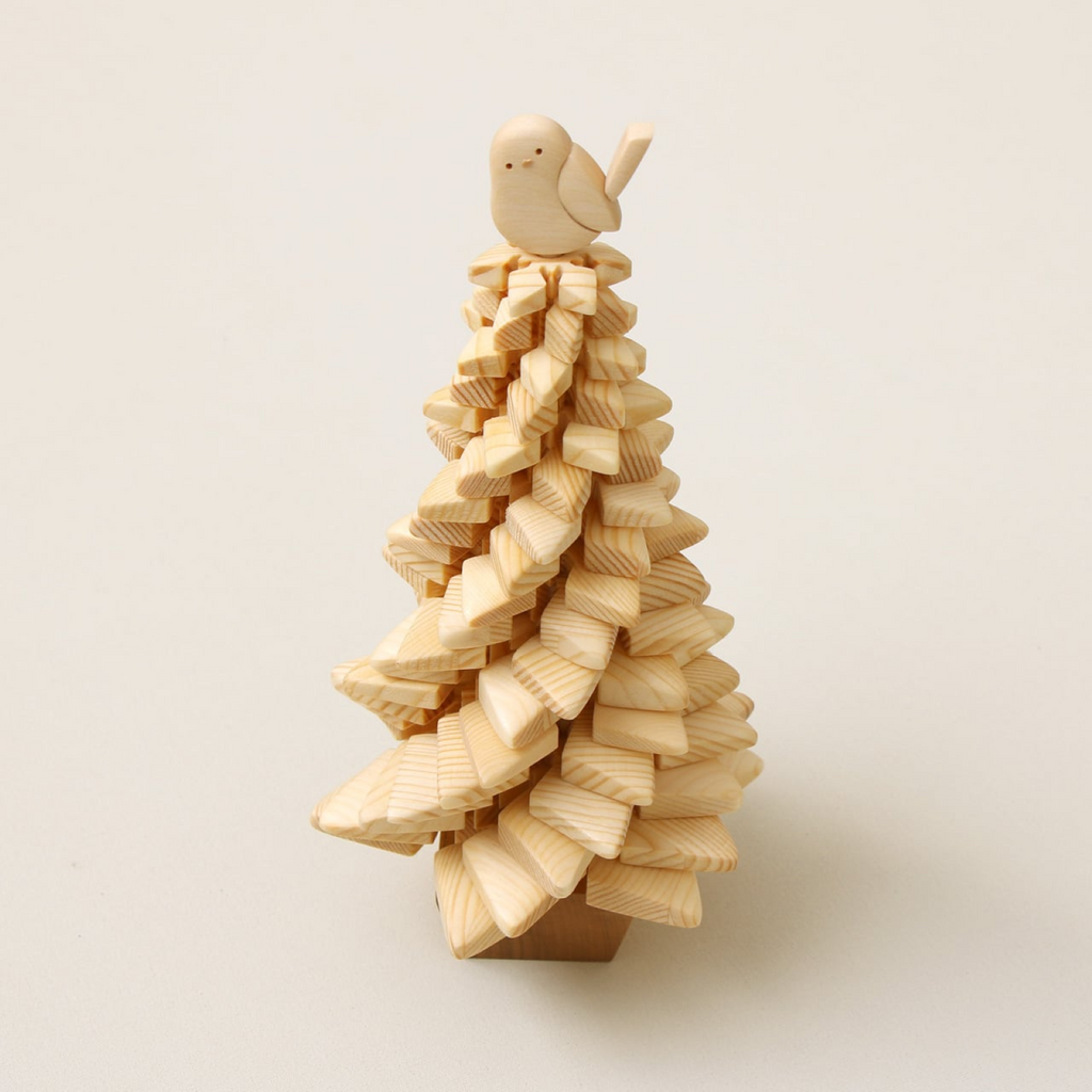 Crafted from natural woods including white spruce, Japanese mountain cherry, and linden (basswood), the piece highlights the gentle color contrasts and grain patterns of real wood. Each ornament is unique due to the natural materials used.