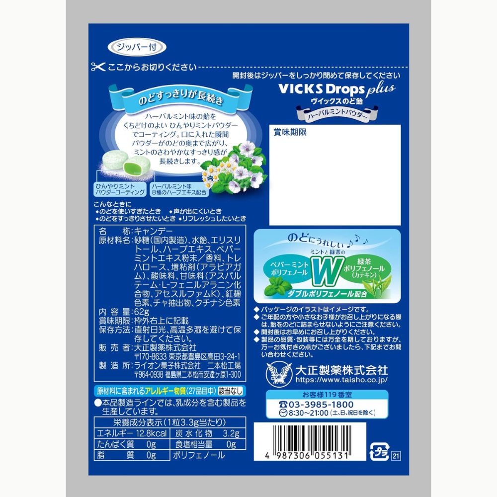 Vicks Throat Candy Plus Herbal Mint Powder features a smooth, powder-coated candy that spreads a refreshing sensation throughout your throat. Formulated with carefully selected 8 kinds of herbal extracts for soothing care. Comes in a convenient resealable pouch.