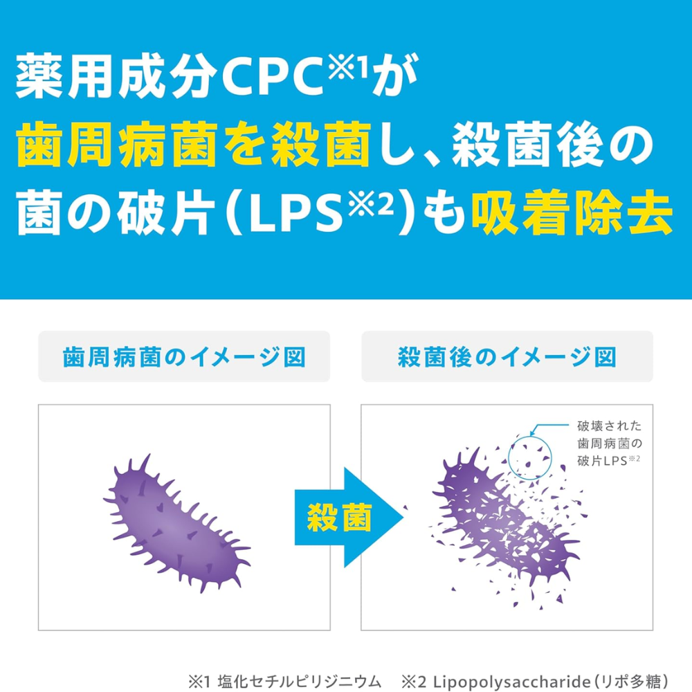 Kills bacteria that cause gum disease and absorbs bacterial residues (LPS)