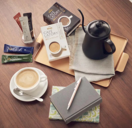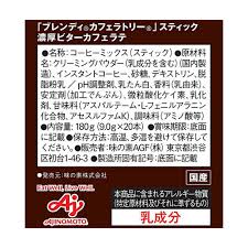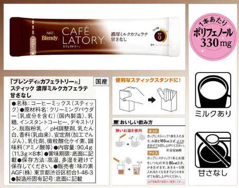 Ingredients: Creaming powder (contains dairy ingredients) (domestically produced), instant coffee, sugar, dextrin, skim milk powder, pH adjuster, milk protein, flavoring (dairy-derived), stabilizer (processed starch), fine silicon dioxide, emulsifier, sweeteners (aspartame-L-phenylalanine compound, acesulfame K), seasoning (amino acids, etc.)