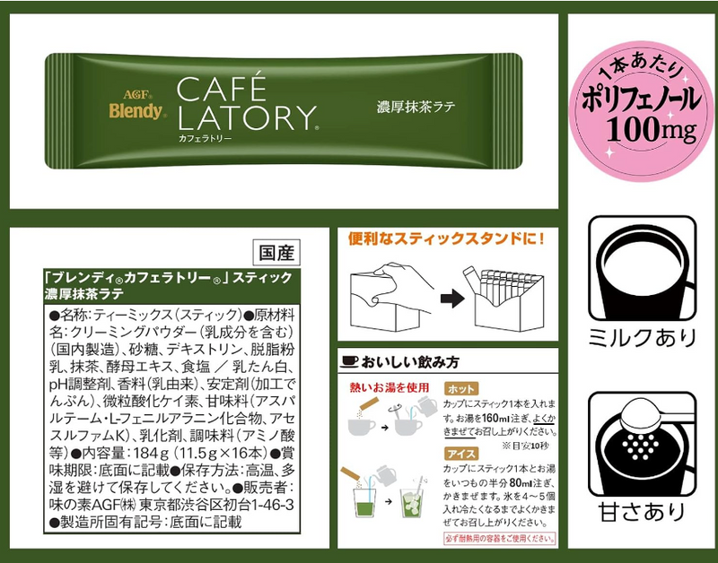 Discover the perfect balance of rich matcha and creamy latte with AGF Blendy Cafe Ratory Sticks. Each box contains 16 individually wrapped sticks of powdered matcha goodness, making it convenient for you to enjoy a cafe-quality drink anytime, anywhere. Elevate your matcha experience with this premium blend.