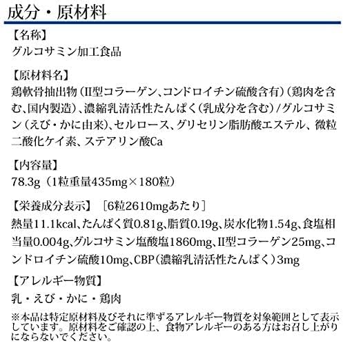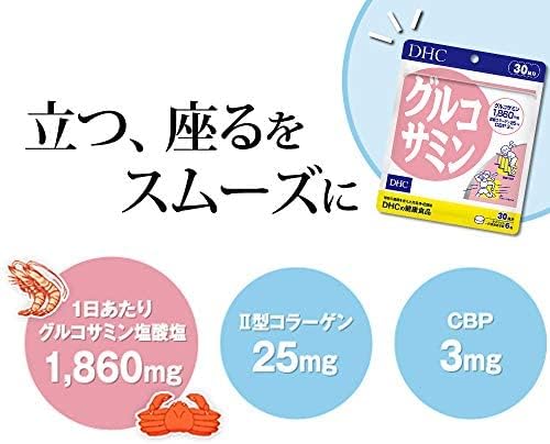 - Ingredient Details: Glucosamine is an amino sugar (mucopolysaccharide) found in the body, which decreases with age. DHC’s glucosamine supplement is derived from chitin found in crab and shrimp shells, providing natural glucosamine. It also includes type II collagen, chondroitin, and CBP (collagen biopeptide) to support smooth movement.
